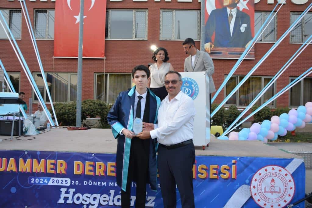 Mezun olan öğrencilerin sınıfları teker teker çağrılarak anı diplomaları takdim edildi. Bu yıl emekli olan Fizik öğretmenimiz Kenan EROL, okulumuz öğrencilerini mezuniyet gününde yalnız bırakmadı. Kenan hocamıza Türkan Dereli İlkokulu Müdürü Yalçın İLGÜN tarafından çiçek takdim edildi.