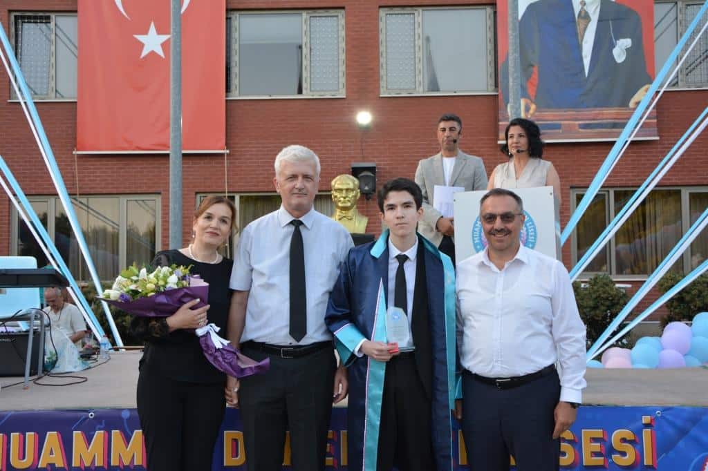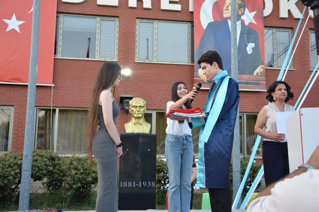 Daha sonra sahneye okul birincisi gelerek oldukça anlamlı bir konuşma yaparak okul şeref kütüğüne bröve çaktı. Tüm izleyicilerden büyük alkış aldı. Şanlı Bayrağımız ve okul flamasını okul birincimiz Onur ÇONGAR, 11. sınıf öğrencimiz Irmak KOÇYİĞİT’e teslim etti.
